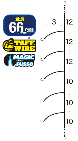 この仕掛けは、全長66cmで5本針になっており、各針の感覚は10cm毎に付いています。ワカサギ釣りでは、いかに手返しが良いかが数を釣るのに重要になっており、この仕掛けでは、糸絡みも少なく、釣りに集中できる仕掛けになっています。